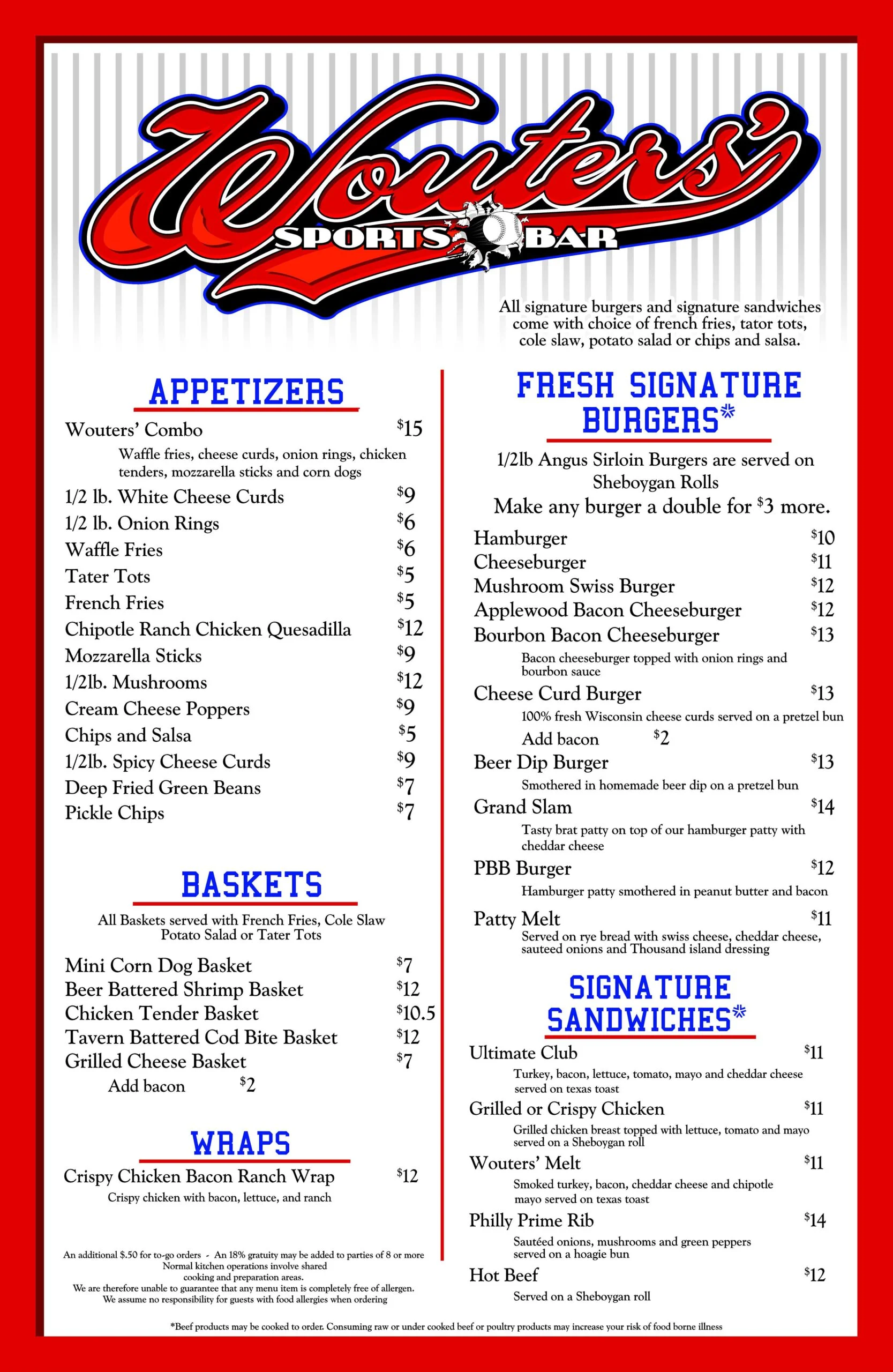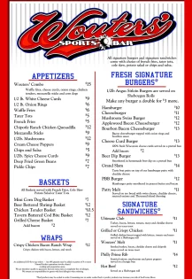 Wouters Wouters Sports Bar & Grill offers a variety of delicious food options including burgers, wings, pizzas, and more. Our extensive drink menu features an array of craft beers, signature cocktails, and refreshing beverages. Come and enjoy the best of both worlds at Wouters! Sports Bar & Grill prides itself on offering a diverse menu that caters to all taste buds. From mouthwatering burgers and sizzling steaks to delectable seafood and vegetarian options, our kitchen is committed to serving up delicious dishes made with the freshest ingredients.
